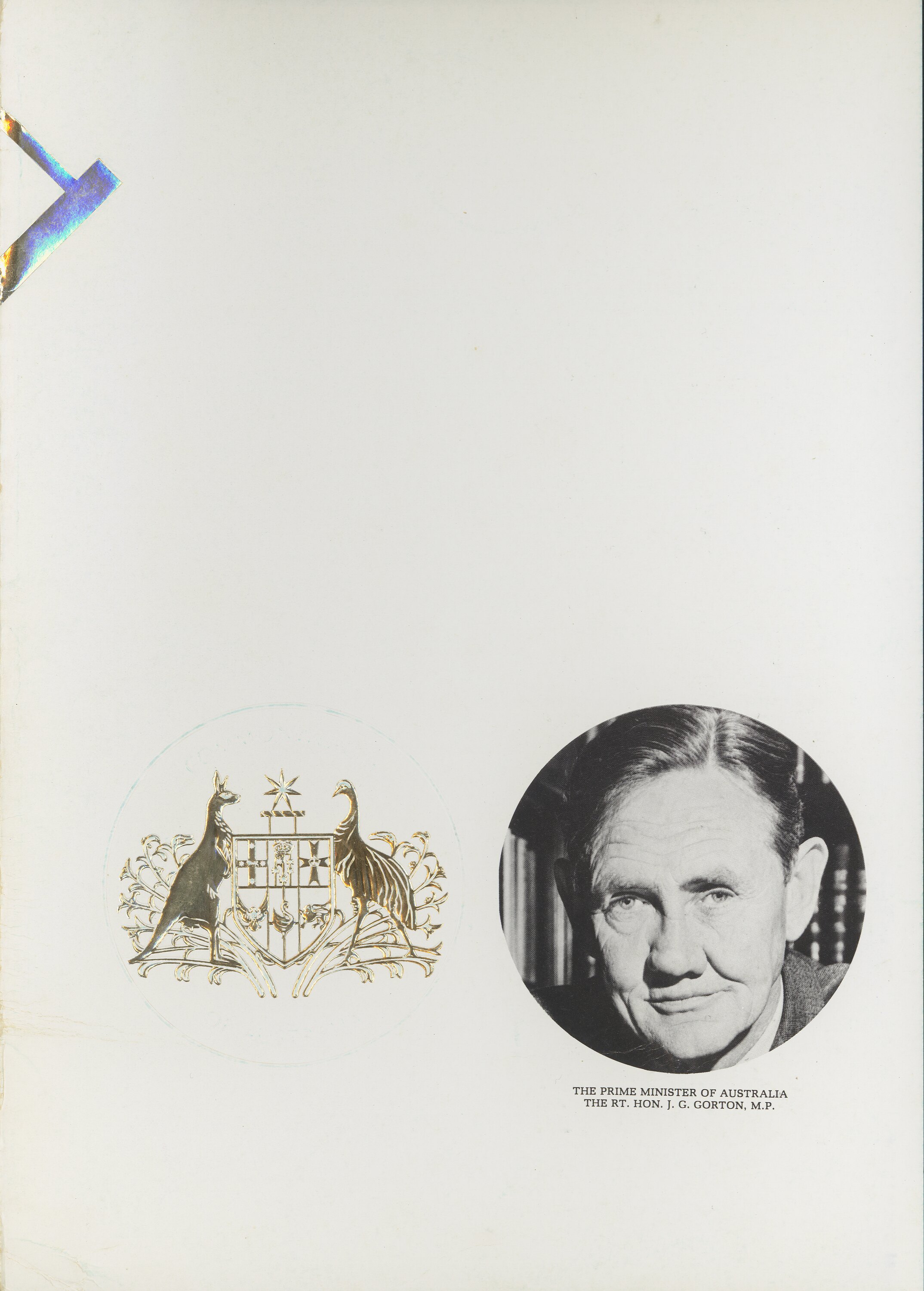 Folio-sized staple-bound booklet with folded soft cover, printed in black, teal, blue, green and gold ink on white paper stock. The front cover features a stylised plan of the Melbourne Airport runways and terminal buildings printed in embossed gold, with the words "MELBOURNE AIRPORT" inside a blue circle. On the end sleeve inside the front cover is an embossed gold crest of the Commonwealth of Australia and a circular portrait of The Prime Minister of Australia, The Rt Hon J.G. Gorton, M.P.. On the end sleeve inside the back cover is a map of the Melbourne Airport Boundary, Runways and Terminal Buildings together with reservations for future runways, superimposed on The City of Melbourne municipality, and a second map of the Terminal Building, Access Roads and Freeway Ramps superimposed on a map of the Melbourne Central Business District.