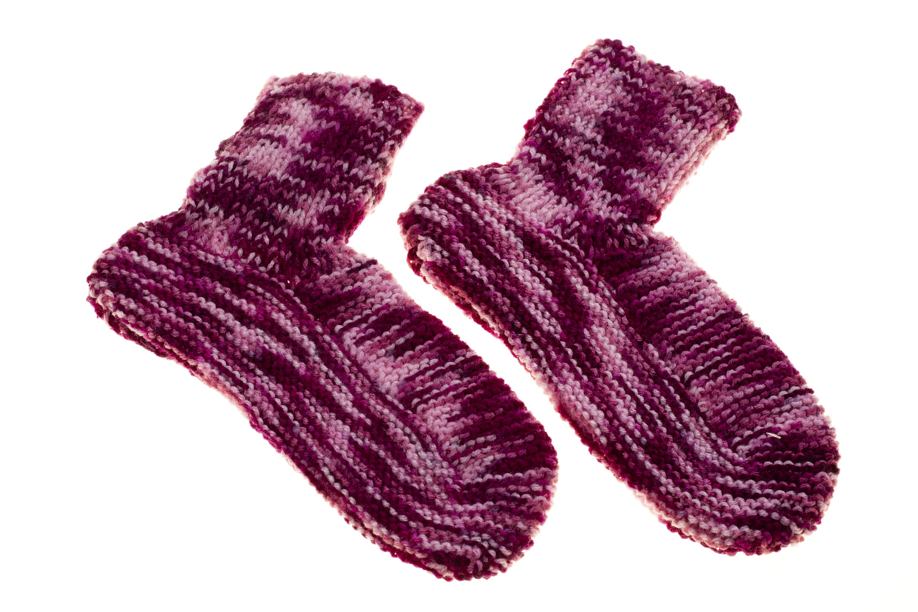 Pair of woollen bed socks hand knitted in variegated wool in shades of pink through burgundy.