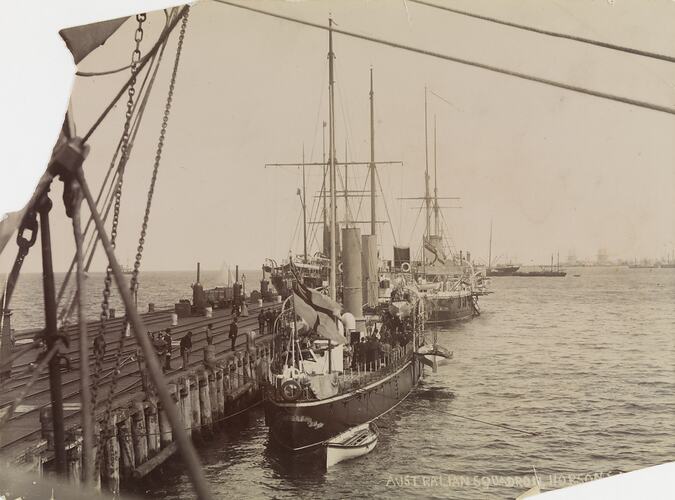 Monochrome photograph of several steam and sailing ships from the Australian Squadron of the British Navy moored at Hobson's Bay, Williamstown, taken by the studio of Nettleton & Arnest circa 1890.