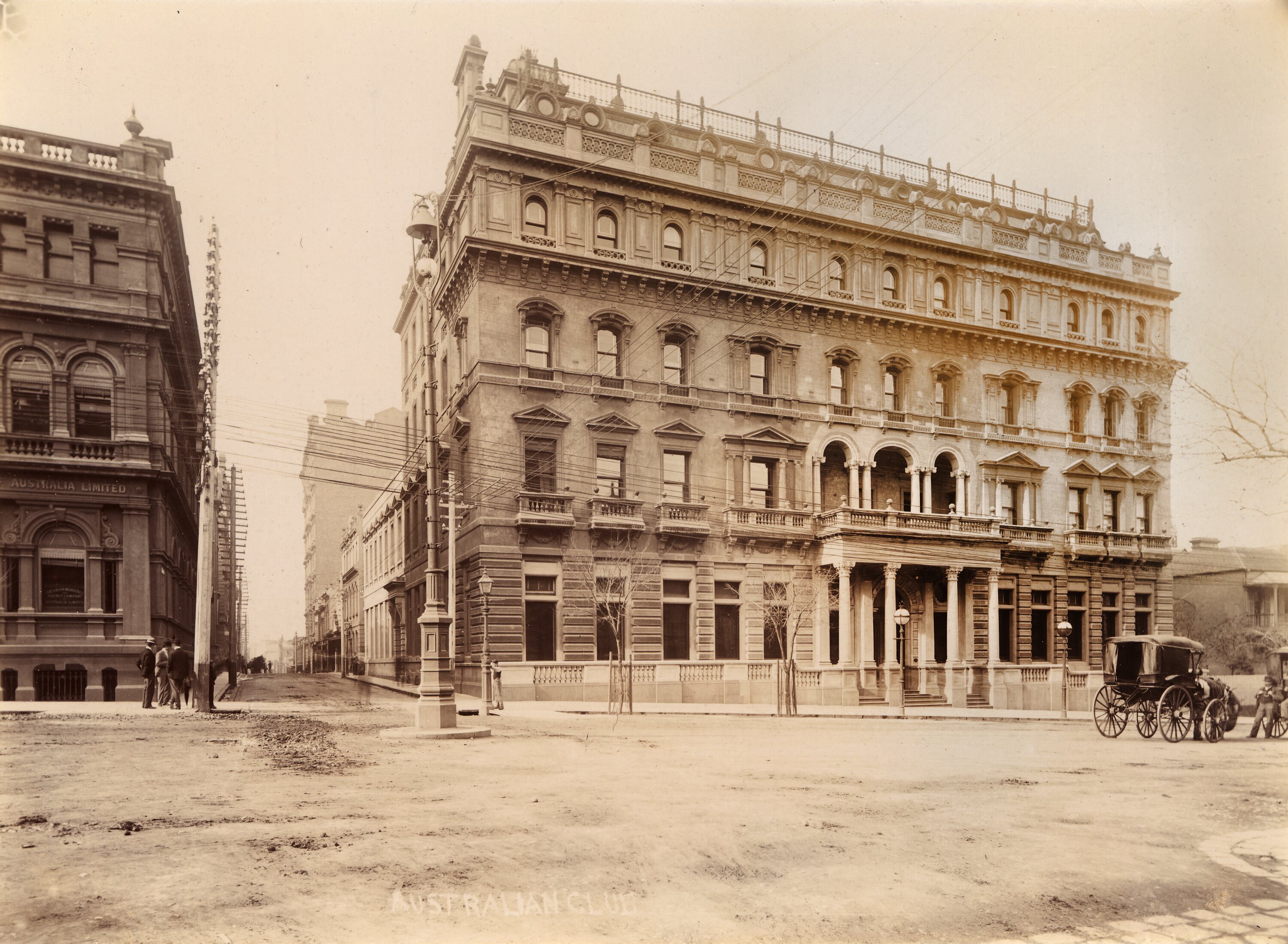 Exterior of the Australian Club, William Street, Melbourne, consisting of a four story stone building with a small portico over the front entrance and a large balcony on the second story. Several horse drawn vehicles are parked outside the club, and a group of people are standing outside nearby offices.