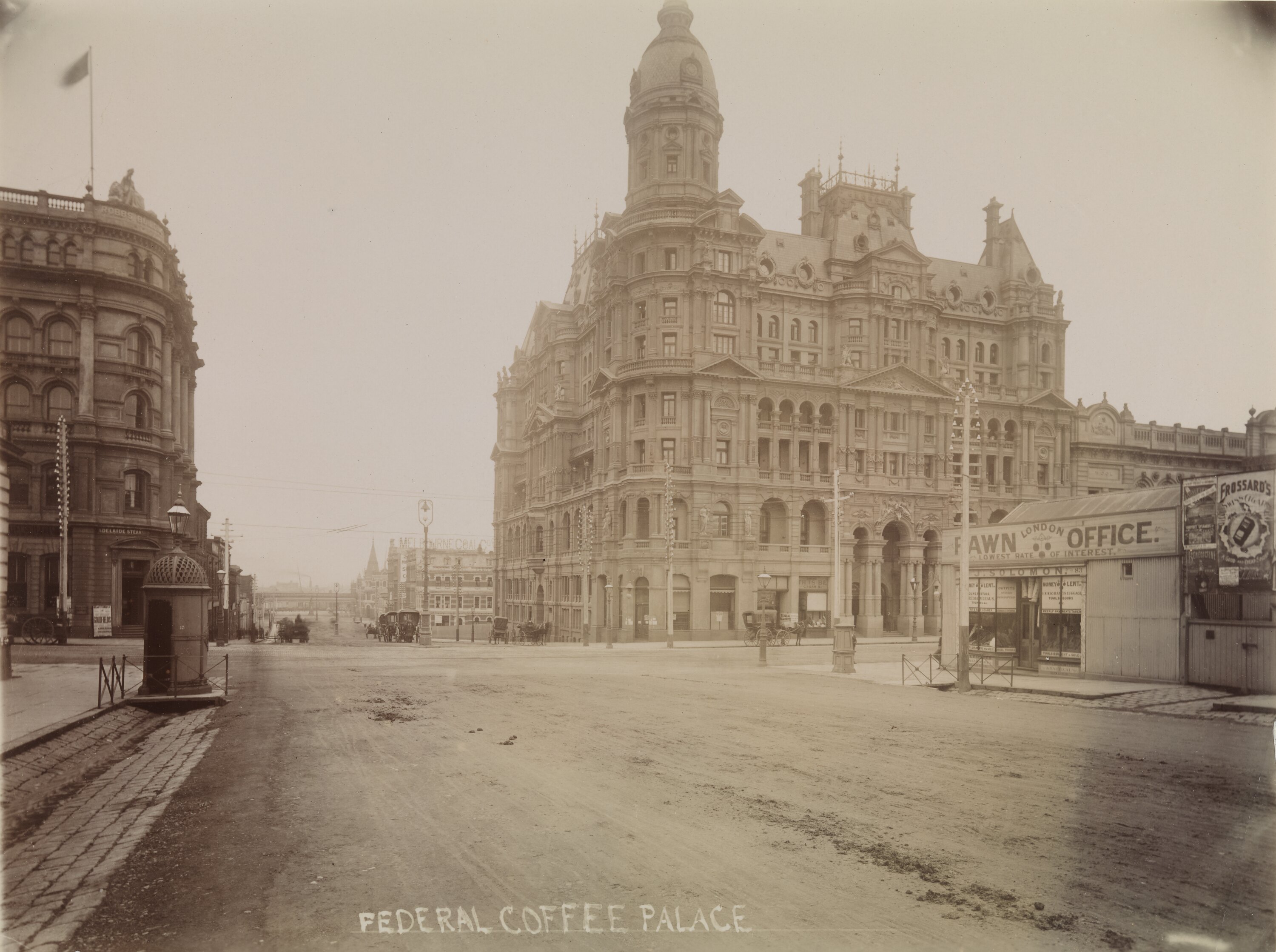 Monochrome photograph of the Federal Coffee Palace on the corner of Collins and King Streets, taken by the studio of Nettleton & Arnest, circa 1890.