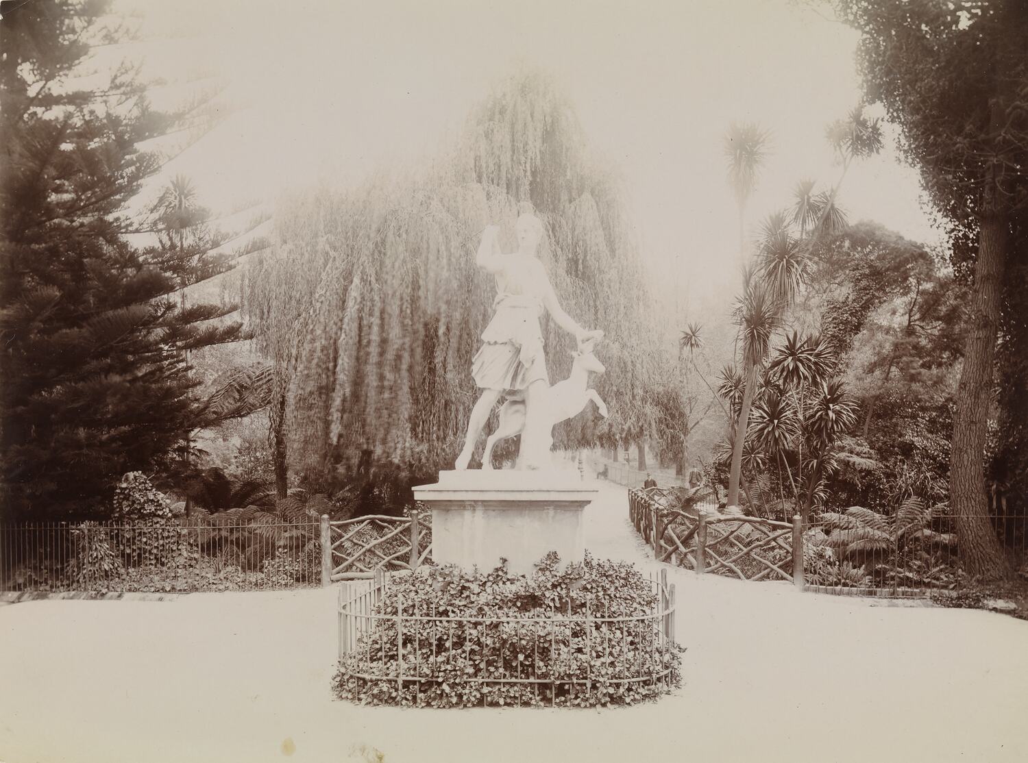 A section of a formal public gardens showing a statue of a young woman, possibly Diana the Huntress, holding the antlers of a young fawn. Nearby is a bridge crossing a fern gully and a number of large trees, including palms and weeping willow.