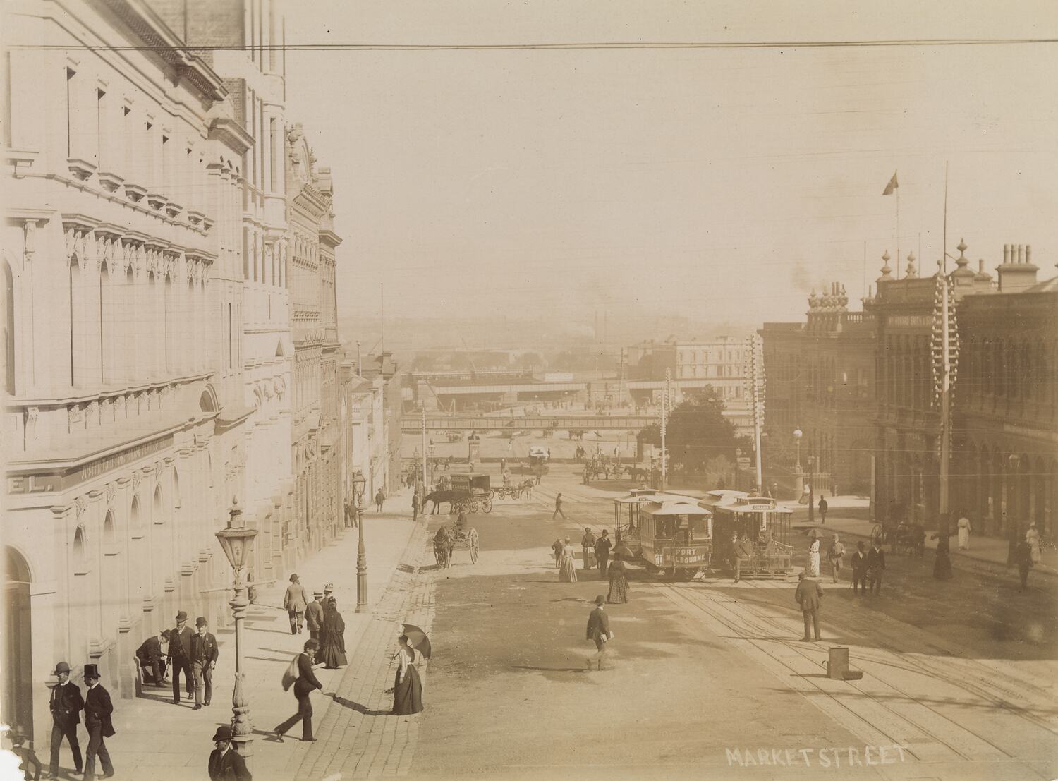 Monochrome photograph of Market Street, Melbourne, looking south towards Flinders street, taken by the studio of Nettleton & Arnest, circa 1890.