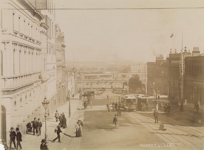 A view of Market Street, Melbourne, looking south towards Flinders street, showing a number of stone office buildings, a railway bridge, and several factory complexes in the distance. Two cable trams and a number of horse drawn vehicles are travelling along the street.