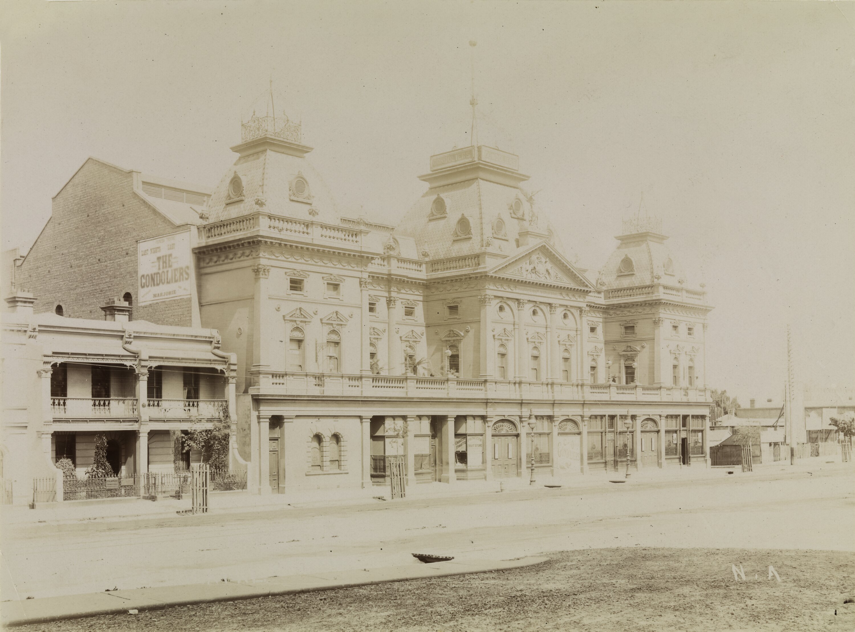 Exterior of the Princess Theatre, Spring Street, Melbourne, displaying advertising for the current production of 'The Gondoliers'. Several shops and houses are visible nearby.