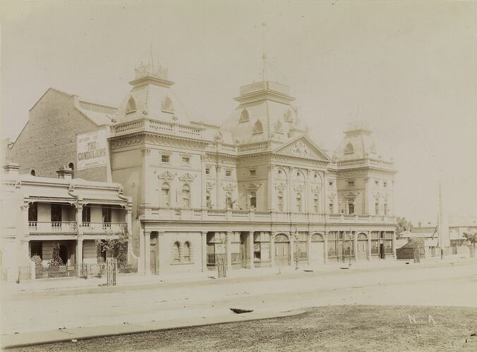 Monochrome photograph of the exterior of the Princess Theatre, Spring Street, Melbourne taken by the studio of Nettleton & Arnest, circa 1890.