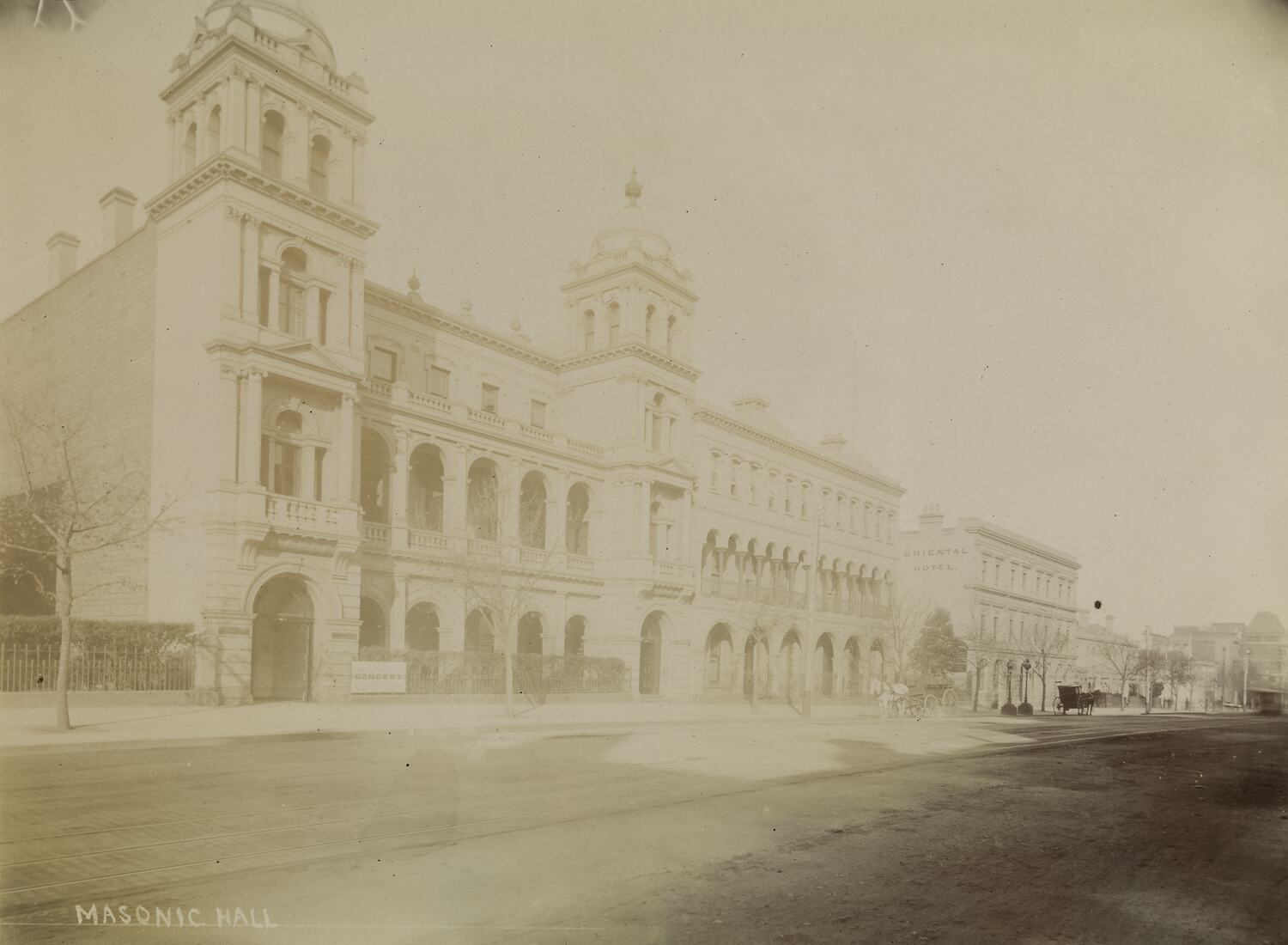 Monochrome photograph of Masonic Hall, Collins Street, Melbourne, taken by the studio of Nettleton & Arnest, circa 1890.