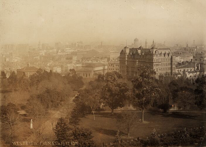 Melbourne from the dome of the Royal Exhibition Building, looking west across the Carlton Gardens. Various buildings are visible including the Royal Society [at left], Queen's Coffee Palace [at right] and, in the distance, the dome of the Supreme Court of Victoria.