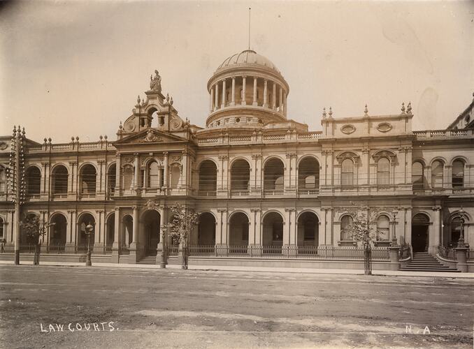 Monochrome photograph of the Law Courts (now the Supreme Court), Lonsdale Street, Melbourne, taken by the studio of Nettleton & Arnest, circa 1890.