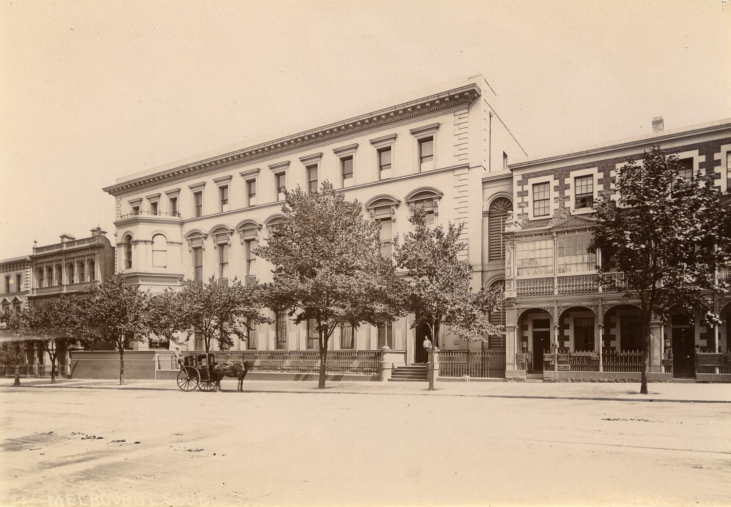 An exterior view of the Melbourne Club, Collins Street, Melbourne (designed by Leonard Terry) showing a man standing in the front doorway, and a horse drawn vehicle parked outside the club. The building is flanked by trees and a number of terraces style buildings are located nearby.