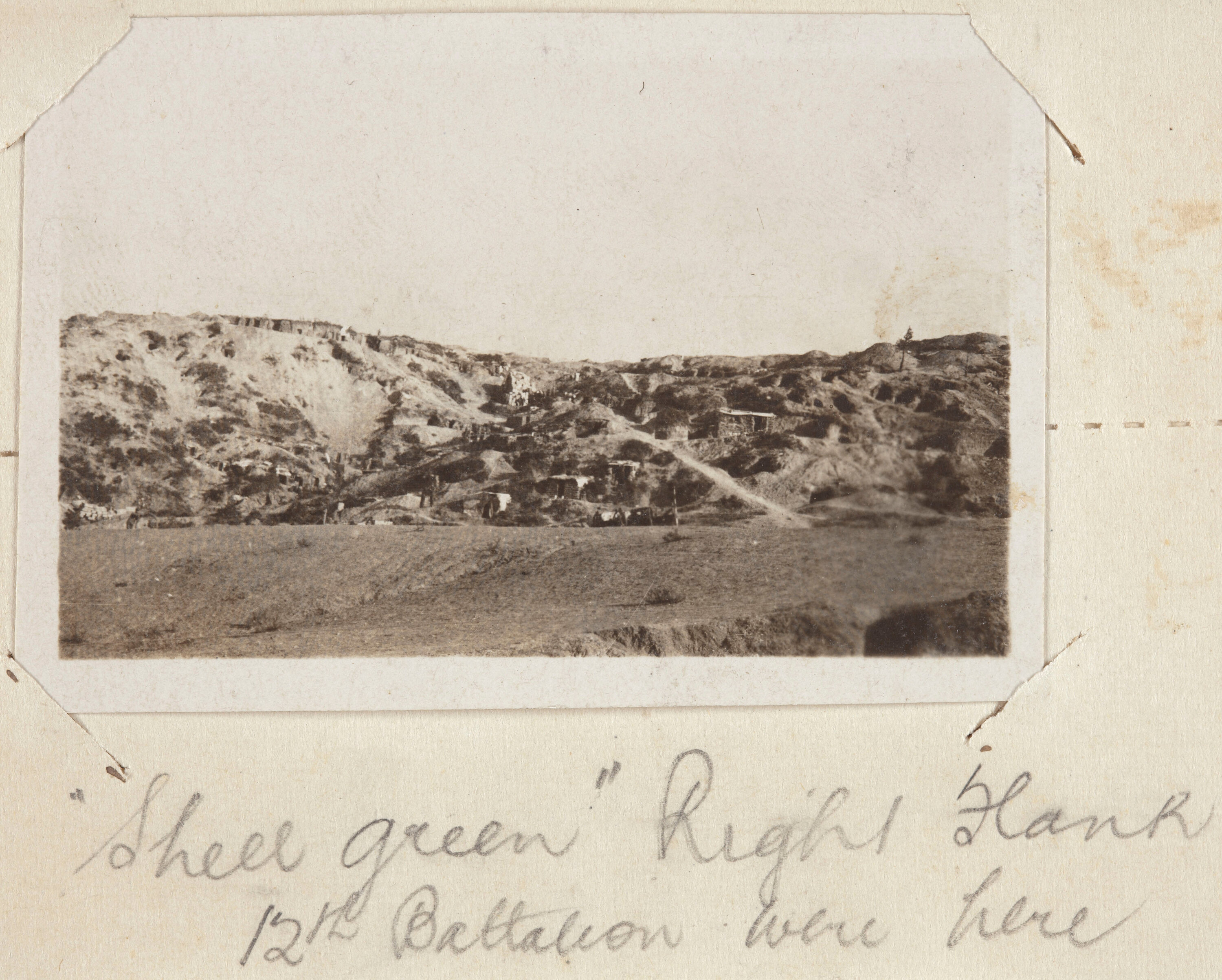 Handwritten in pencil on album page below image: '"Shell green" Right Flank / 12th Battalion were here'