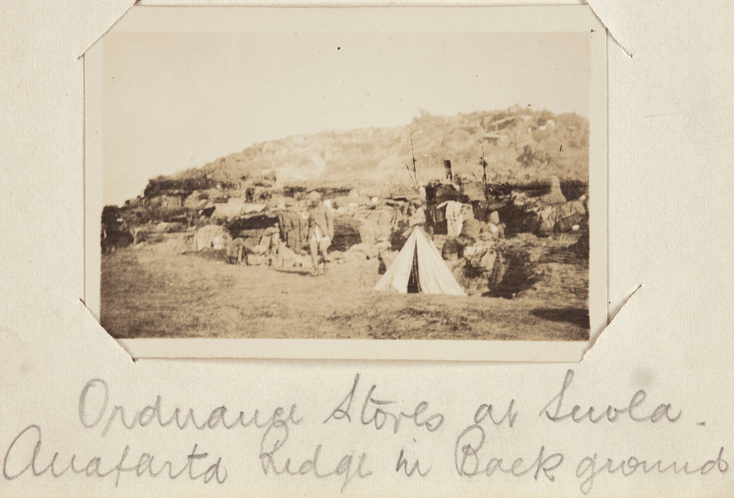 Hand written in pencil below image: 'Ordnance Stores at Suvla. / Anafarta Ridge in Back ground'