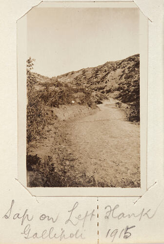 This photograph is in a very significant album which includes a number of excellent photographs of Australian soldiers at Gallipoli and surrounding areas. Some of these are particularly clear and well-composed - for example, 'Rest Gully Anzac' shows hundreds of soldiers sitting and standing around talking and a valley with lots of dugouts and shelters. 'Old Kit etc at Anzac Ordnance Stores 1915' is another clear photograph, ,showing rubbish that the Anzacs generated at Gallipoli. Many of the photographs were taken when the weather was hot, but there are also a number of images taken in the snow. Another, 'Extreme Right of Anzac' demonstrates the steepness of the terrain and the mixture of clothing that the soldiers wore. All of the photographs appear to have been taken at times when the photographer was 'off duty', since the images are of the landscape or soldiers at rest.