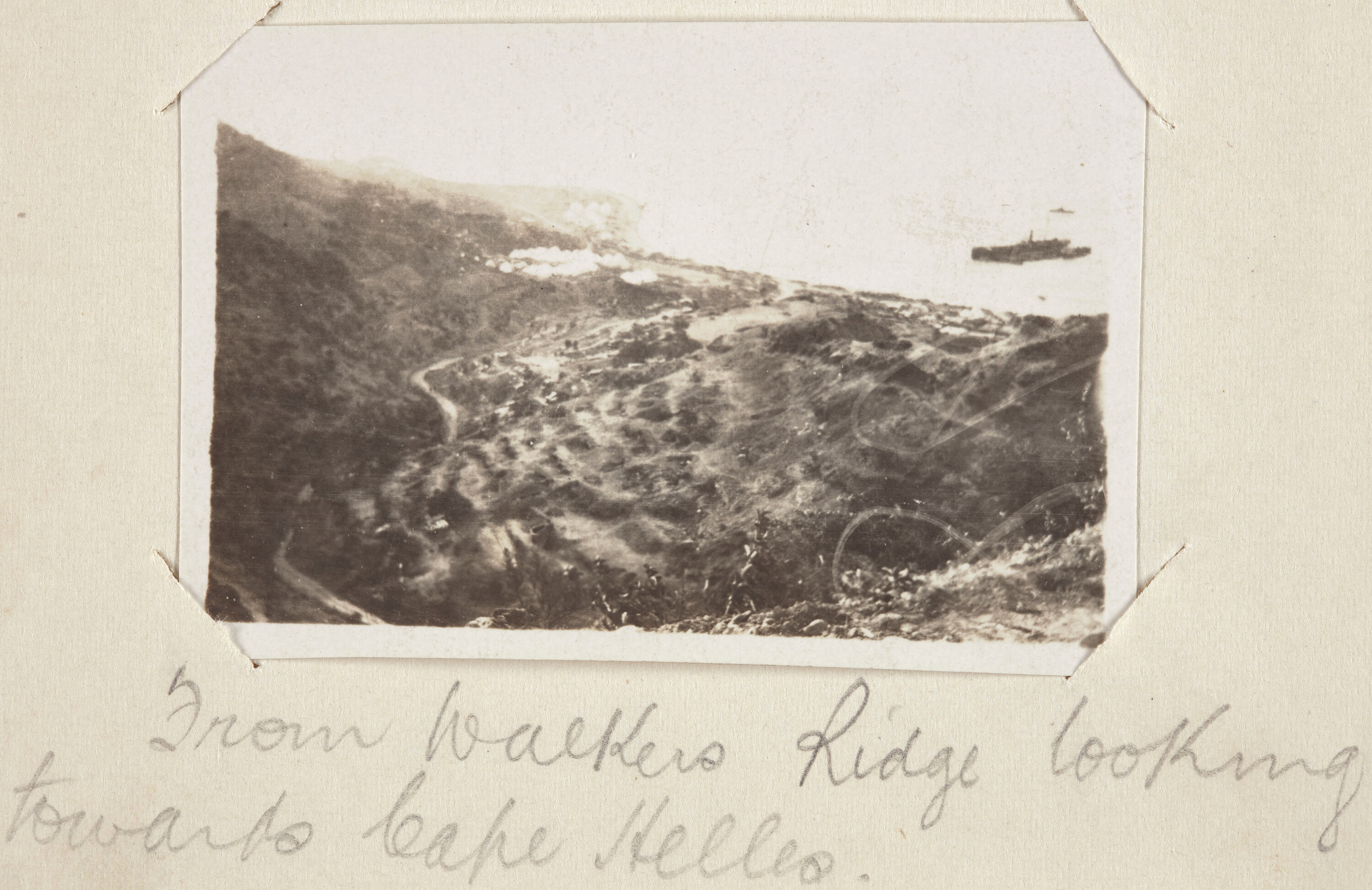 Hand-written in pencil on the support underneath the image: 'From Walkers Ridge looking / towards Cape Helles.'