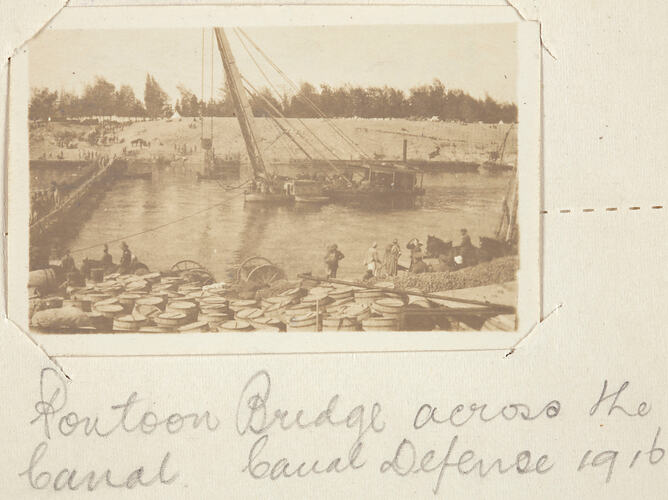 Hand written in pencil below the image: 'Pontoon Bridge across the / Canal. ... Canal Defense 1916'