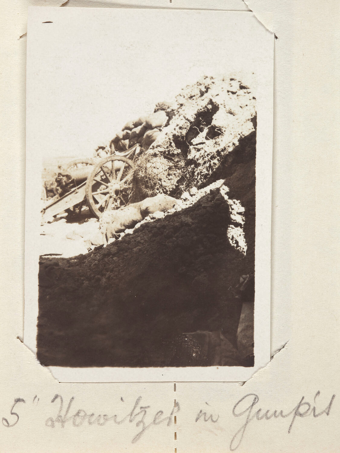 Hand written directly under the photograph: '5" Howitzer in Gunpit'. Hand written in ink on verso: 'Artillery in the / trenches. This is / very unusual in / warfare. / Gallipoli 1916'. [Date possibly incorrect.]