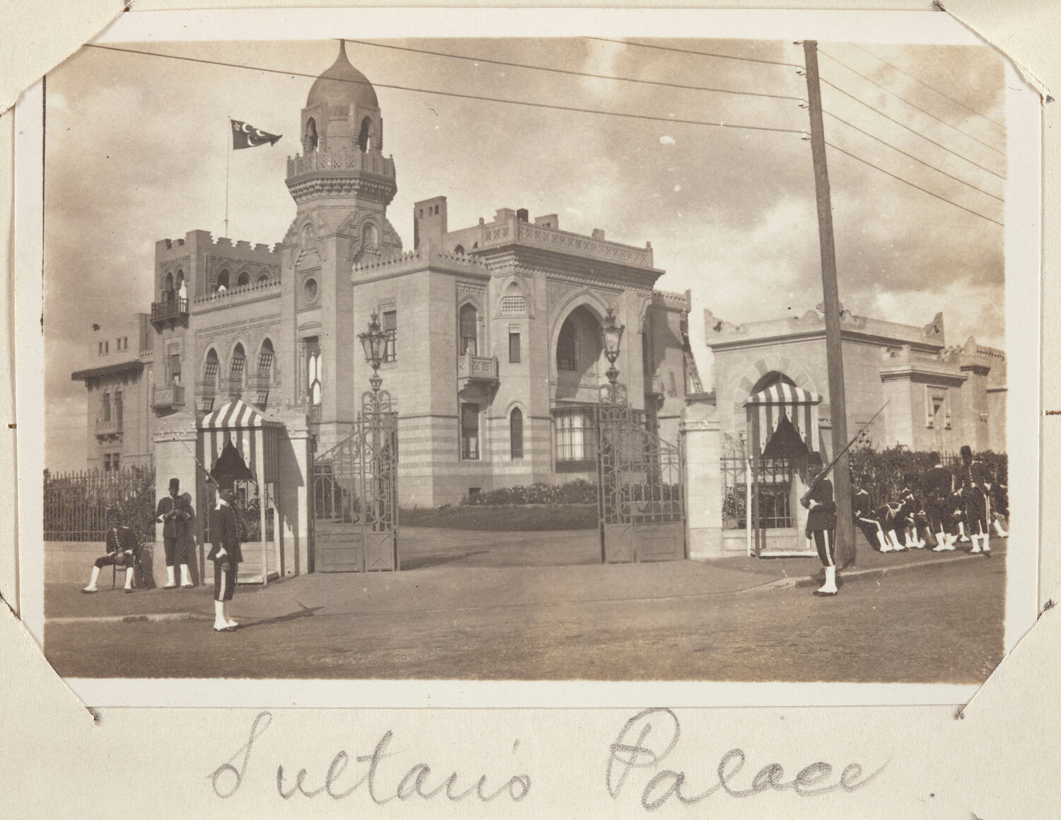 Large building behind gates with turret and arched windows. Nine men in guard uniforms stand or sit in the foreground, two with large bayonette rifles stand guard at sentry tents at the gates. The flag of the Sultanate of Egypt flys from the turret.