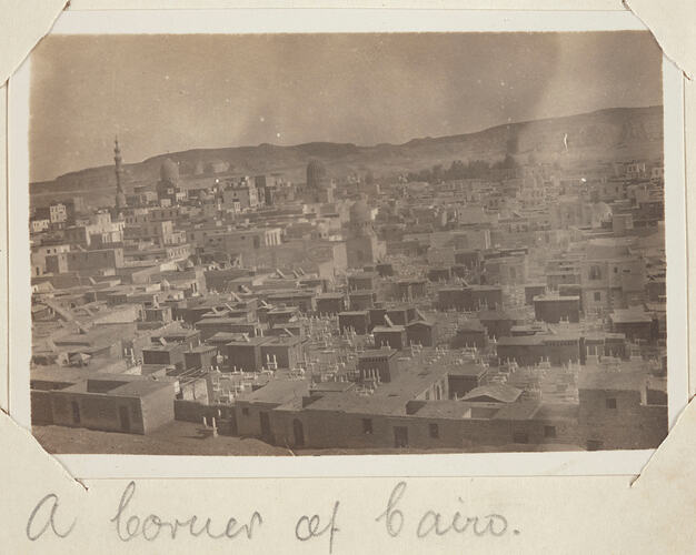Hand written in pencil directly below photograph: 'A Corner of Cairo'. Hand written in ink on verso: 'A corner of Cairo / not all the roofs / are flat. The washing / is generally hung out / on top.'