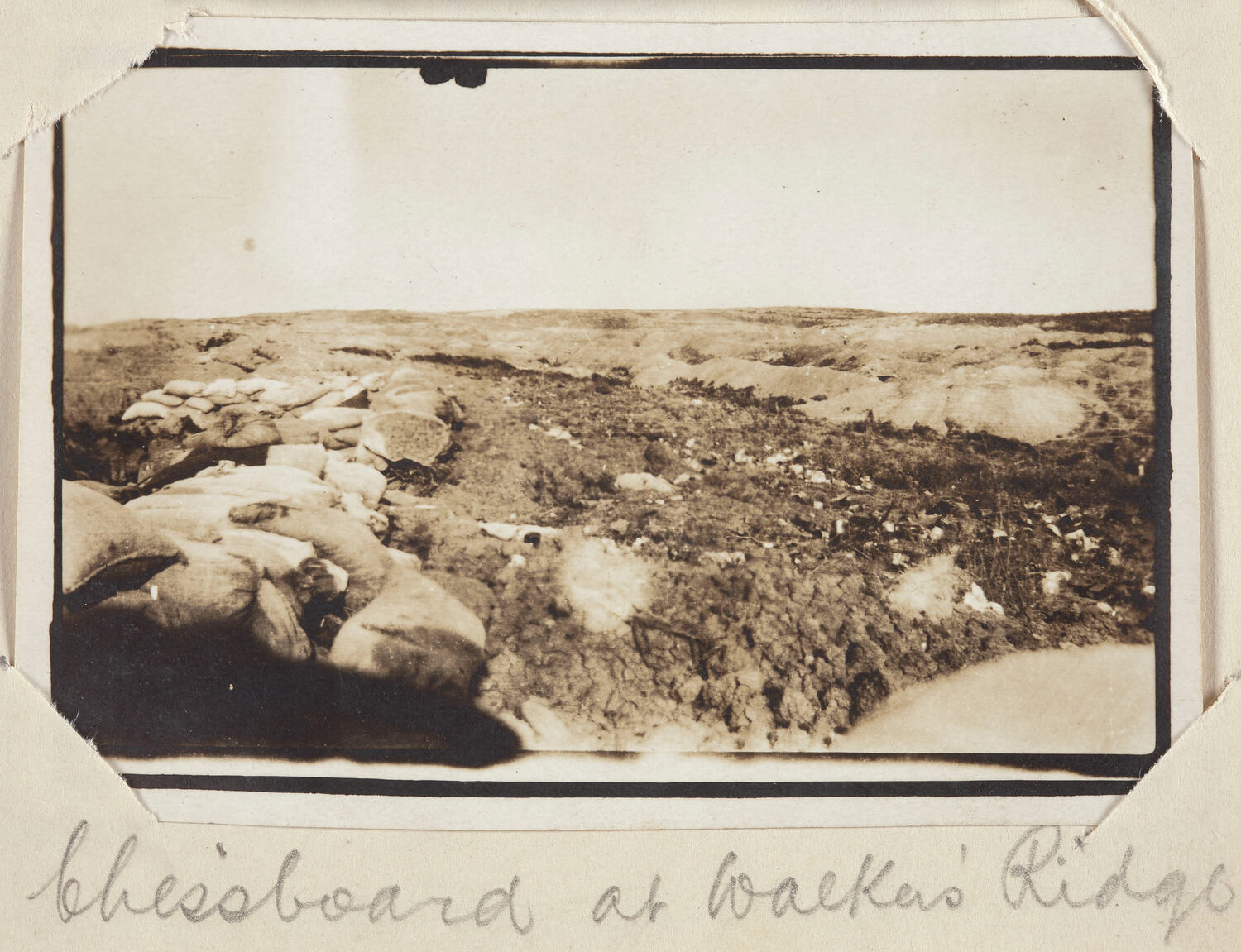 Hand-written in pencil on the support underneath the photograph: 'Chessboard at Wacker's Ridge' Hand-written in pencil on the back of the photograph: '(what appears to be a cross)'
