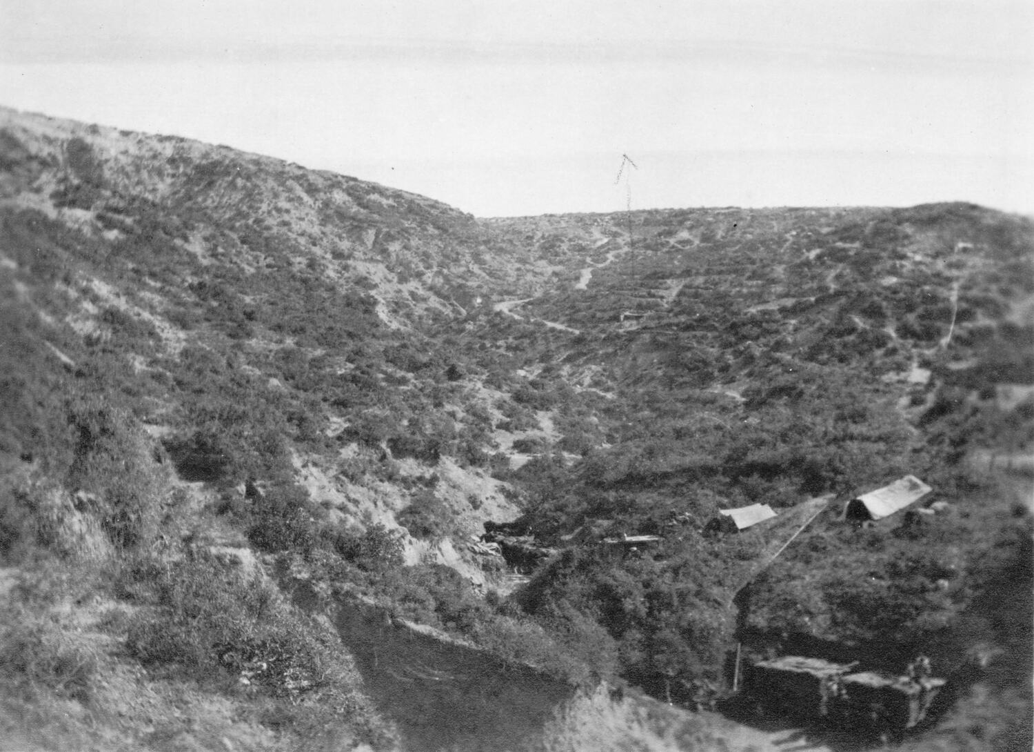 Image of a gully landscape. In the foreground to the right of the photograph there are at least two shelters partially obscured by the vegetation.