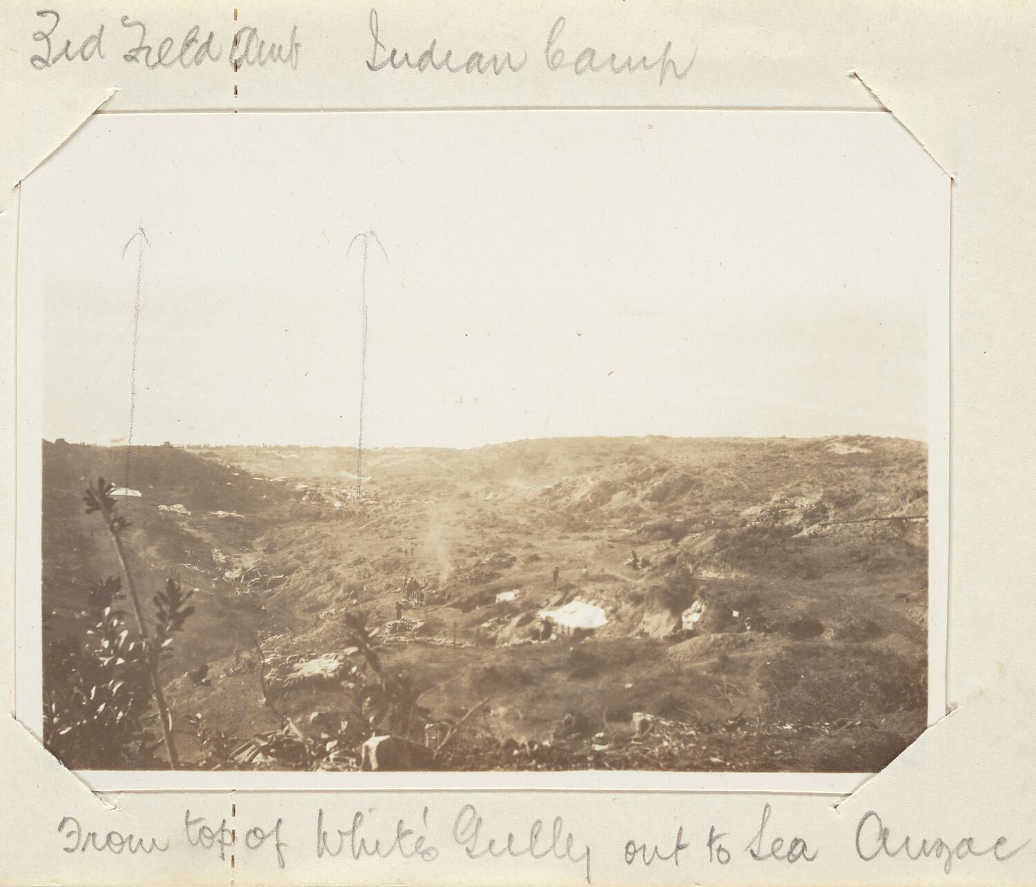 Hand-written in pencil on the support underneath the photograph (left side of the album page): 'From top of Whites' Gully out to Sea Anzac' Hand-written in pencil on the support above the photograph (right side of the album page): '3rd Field Amb Indian Camp' Hand-written in pencil on the photograph: '(two arrows pointing to the top of the photograph)'