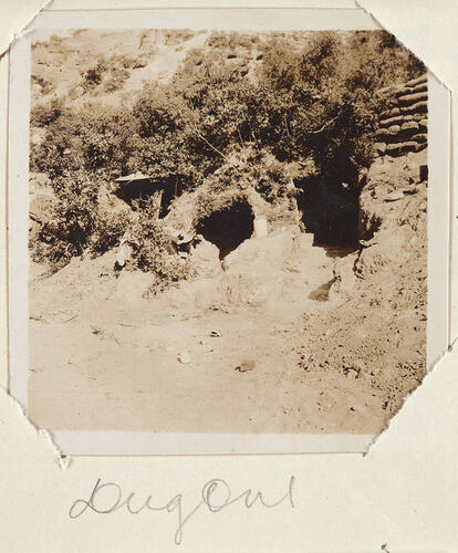 Hand-written in pencil on the support underneath the photograph: 'Dug Out' Hand-written in pencil on the back of the photograph: 'One of the dug / outs. Note the / Sand bags. Also the / (next two lines are difficult to read) / Gallipoli / 1916'