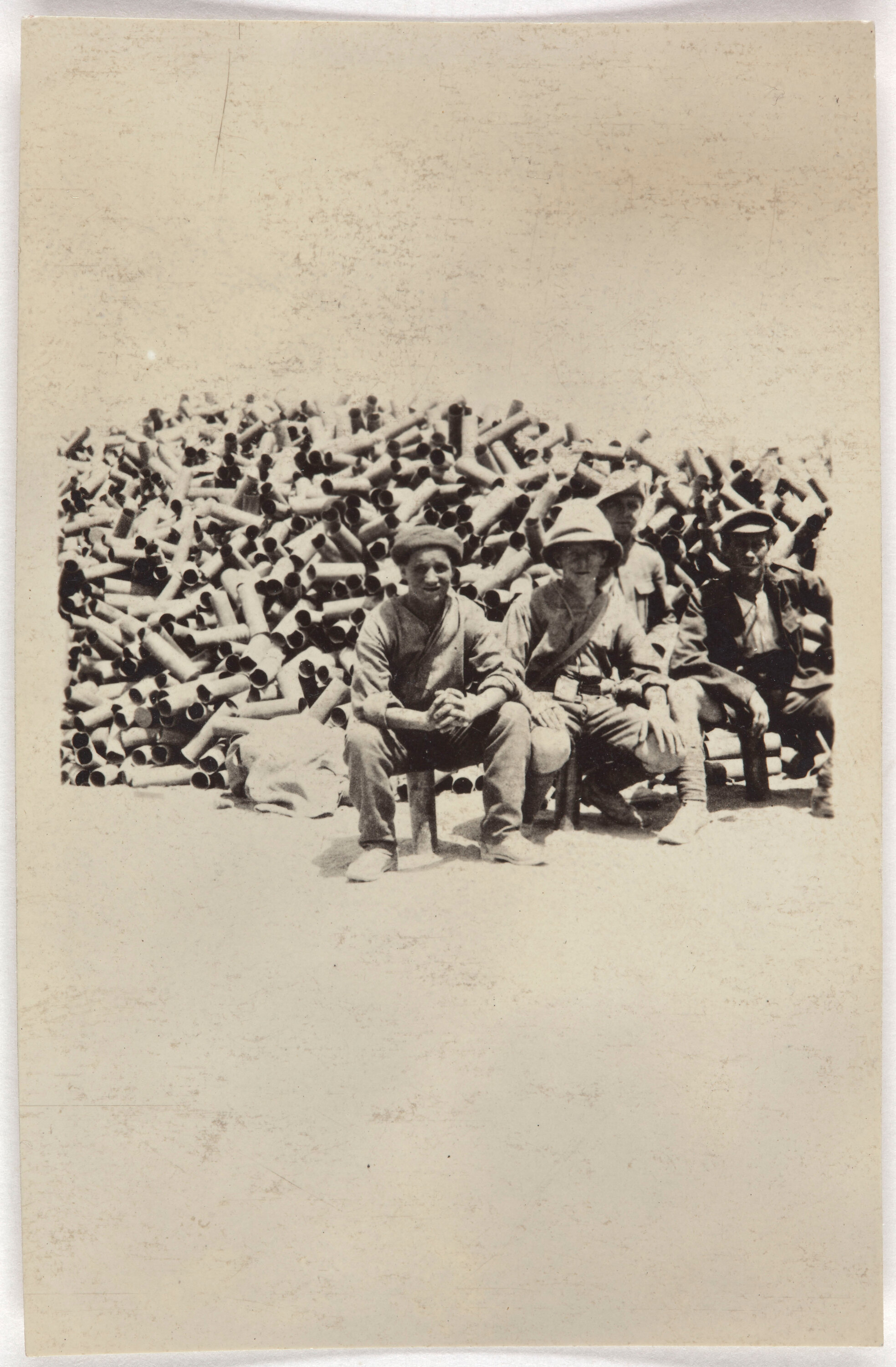 Four men seated on used shell cases in foregound, with large pile of used shell cases in background.