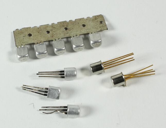 Three transistors, each with three wires protruding from a small aluminium flattened cylinder. Two transistors, with gold plated leads, each with four wires protruding from a small metal cylinder. Five transistors (flattened aluminium cylinder), attached to a wafer of metal.