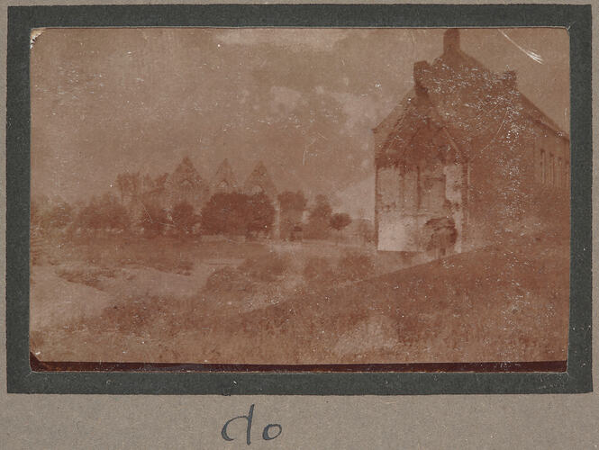 Black and white photographic print which depicts the town of Neuve Eglise, also known as Nieuwkerke. Neuve Eglise is located only 15km away from Ypres and therefore experienced the full impact of the fighting that occurred in the area known as West Flanders. The dividing line between the German and Allied troops ran straight through this area during 1917 and 1918. Due to the town's close proximity to the frontline, the Allied field ambulances and fighting units used the town's Churchyard, especially in the early days, to treat the wounded. The Church that is depicted in this photograph was destroyed during World War I but has since been rebuilt.