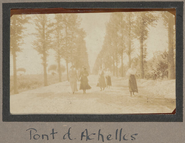 Black and white photographic print which depicts a group of women in Pont d'Achelles. Pont d'Achelles, a small town located close to Armentières, remained close to the battle line throughout the majority of World War I. Pont d'Achelles remained in Allied hands from the 16th of October 1914 to the 11th of April 1918 when the Germans captured the town after hard fighting. The Allied forces recaptured the town on the 3rd of September 1918. An Allied military cemetery was established at Pont d'Achelles in 1917 and it remains in existence today.