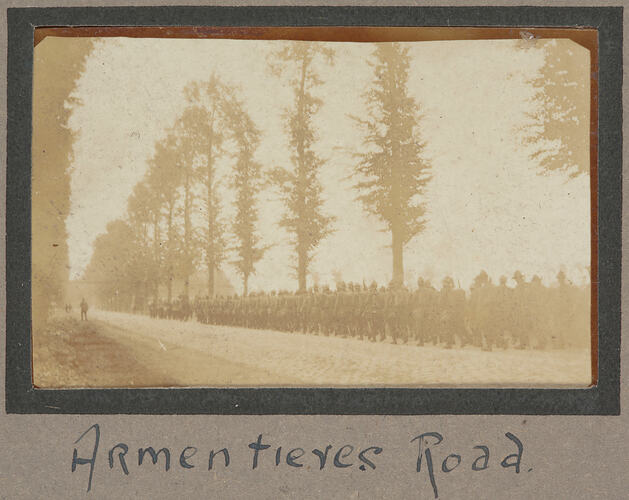 Photograph which depicts an Australian battalion marching along Armentieres Road. This may have been as part of a training routine or possibly towards the trenches on the front line in the Somme region of France. Nearby the township of Armentieres, located in the north east region of France, was an area colloquially known by Australian troops as the 'Nursery'. Australian reinforcements for the Western Front were trained at the 'Nursery' as it was initially considered to be a relatively quiet location away from the main battle sites and suitable for learning the skills of trench warfare. The 'Nursery' later became the departure point for many Australian troops heading to the first Somme battles in 1916.
