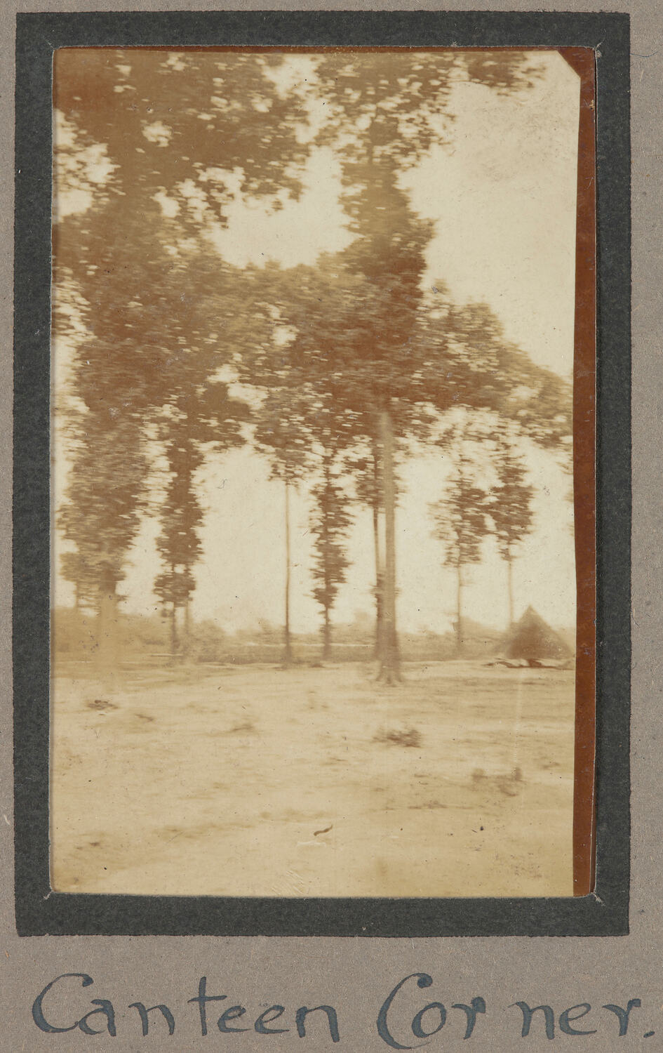 Black and white photographic print which depicts a campsite known as 'Canteen Corner'. The exact location of Canteen Corner is unknown but various records suggest that it was located within the Messines area in Belgium. Severe fighting took place at Messines in mid 1917, including the successful detonation of explosives beneath the German trenches that were reportedly heard in London, Belfast and Switzerland. It took Australian and British soldiers up to two years to secretly tunnel beneath the German trenches and insert the explosives that became an integral strategy to the Allied success at Messines.