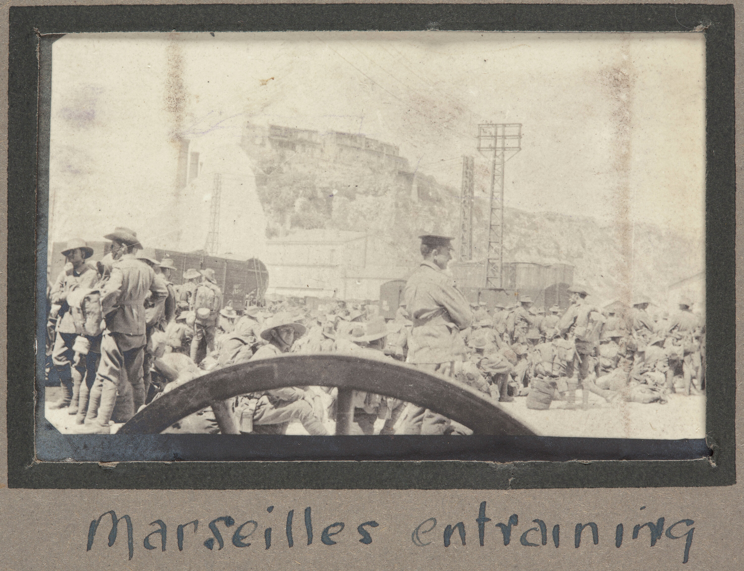 Photograph which shows a large group of soldiers waiting to embark a train in the French city of Marseilles. The 4th Division, of which the 13th Field Ambulance was a part of, arrived in Marseilles in June 1916 and soon after accompanied the 1st and 2nd Division to the Somme region.