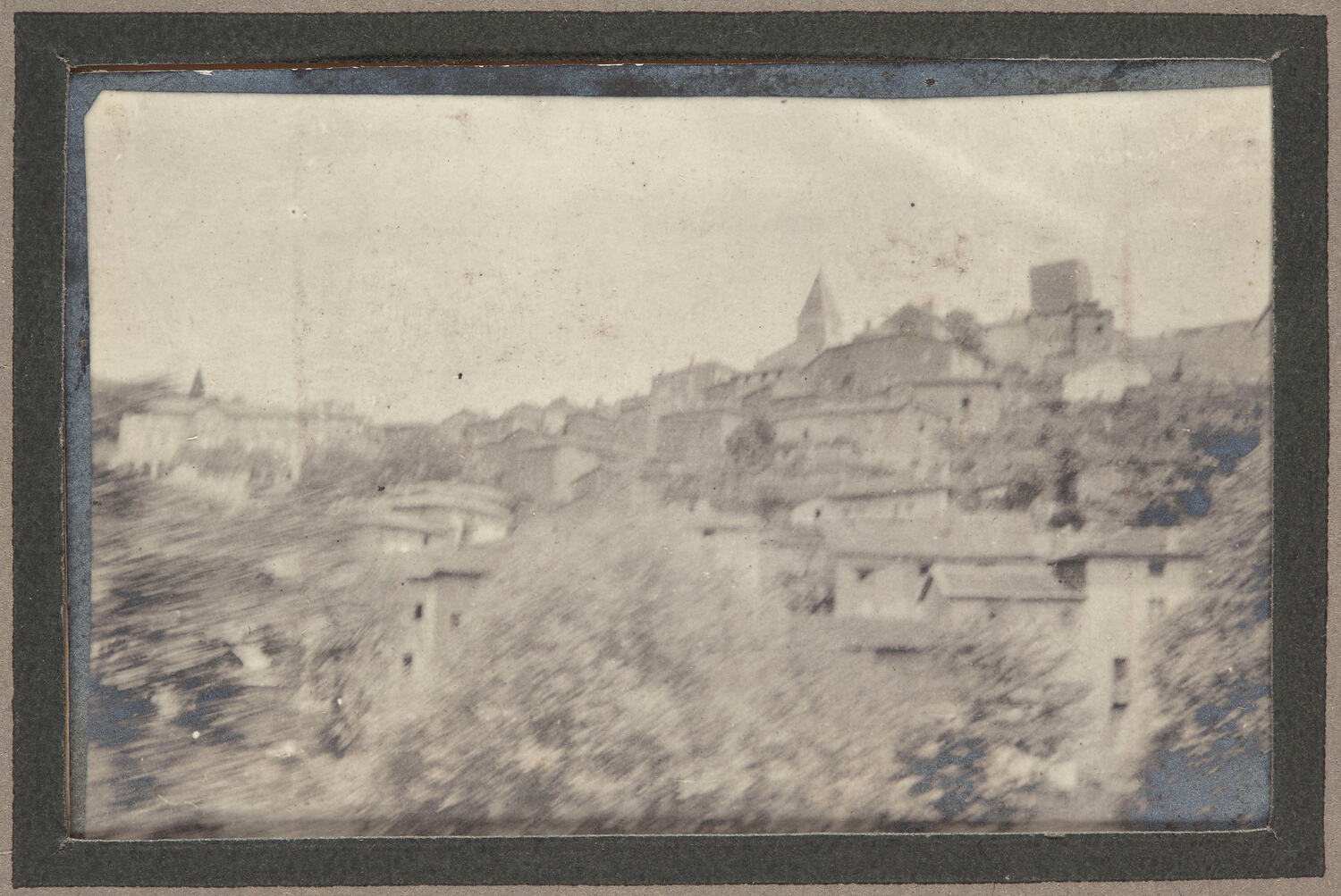 Black and white photographic print which showcases the passing scenery of a French town. As the photograph is slightly blurry it would suggest it was most likely taken from a moving vehicle, such as a train or truck, that was on its way towards the frontline. For most soldiers this was the first time they had been outside of Australia and as a result the much different landscape of the French countryside would have been one of awe and wonder.