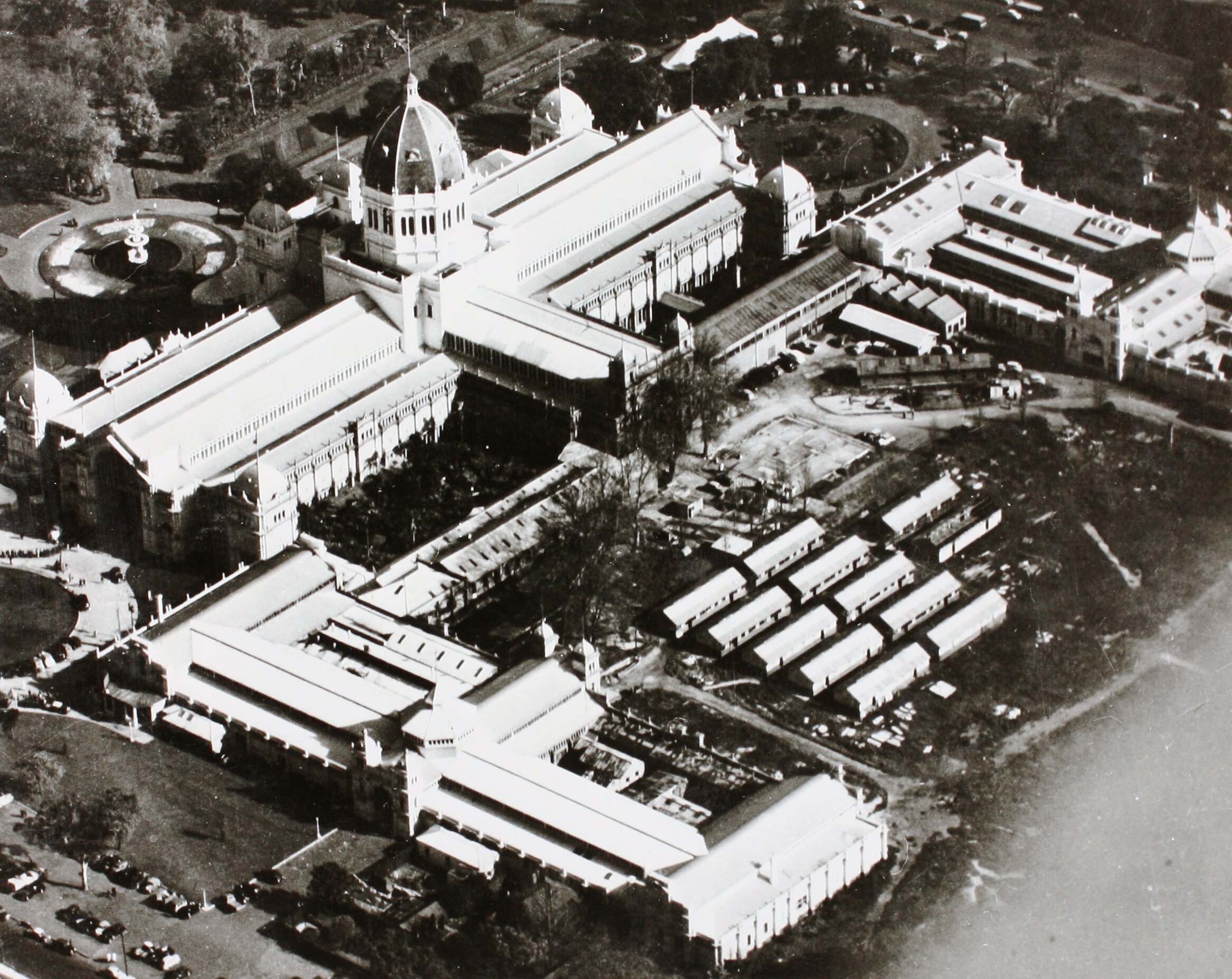 Black & white aerial photograph of the Exhibition Building from north east, taken in 1947. The photograph shows the Exhibition Building, annexes, and remaining huts of the Royal Australian Air Force (RAAF) camp.