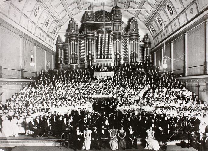 Black & white photograph of a performance in the organ gallery at the western extremity of the Great Hall of the Exhibition Building, 21 December 1907. The photograph shows Dame Nellie Melba and other dignitaries in the foreground with a large orchestra and choir extending back to the organ pipes.