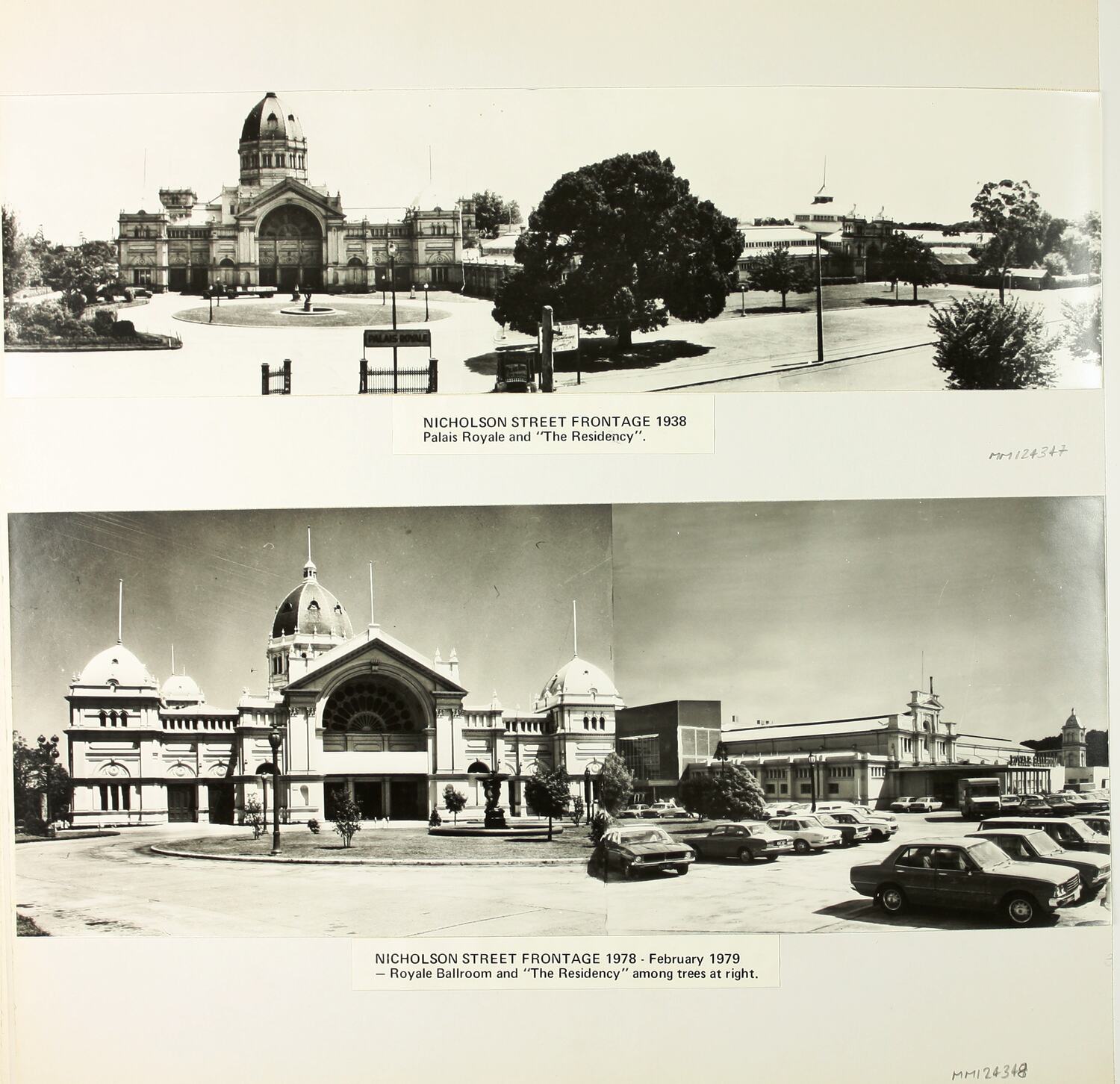 A black & white silver gelatin print comrpised of two images joined together to form a single panoramic print on a page of a photograph album. The image is taken from an elevated vantage point on the eastern side of Nicholson Street, probably from the one of the Royal Terraces, looking west, showing the eastern nave, the French fountain in the court in front of it, the Palais Royale in the Building's eastern annexe and 'The Residency' - the director's residence - as it appeared in 1938. A sign can be seen at the main Nicholson Street entrance for the Palais Royale. There is a printed caption below the photograph.