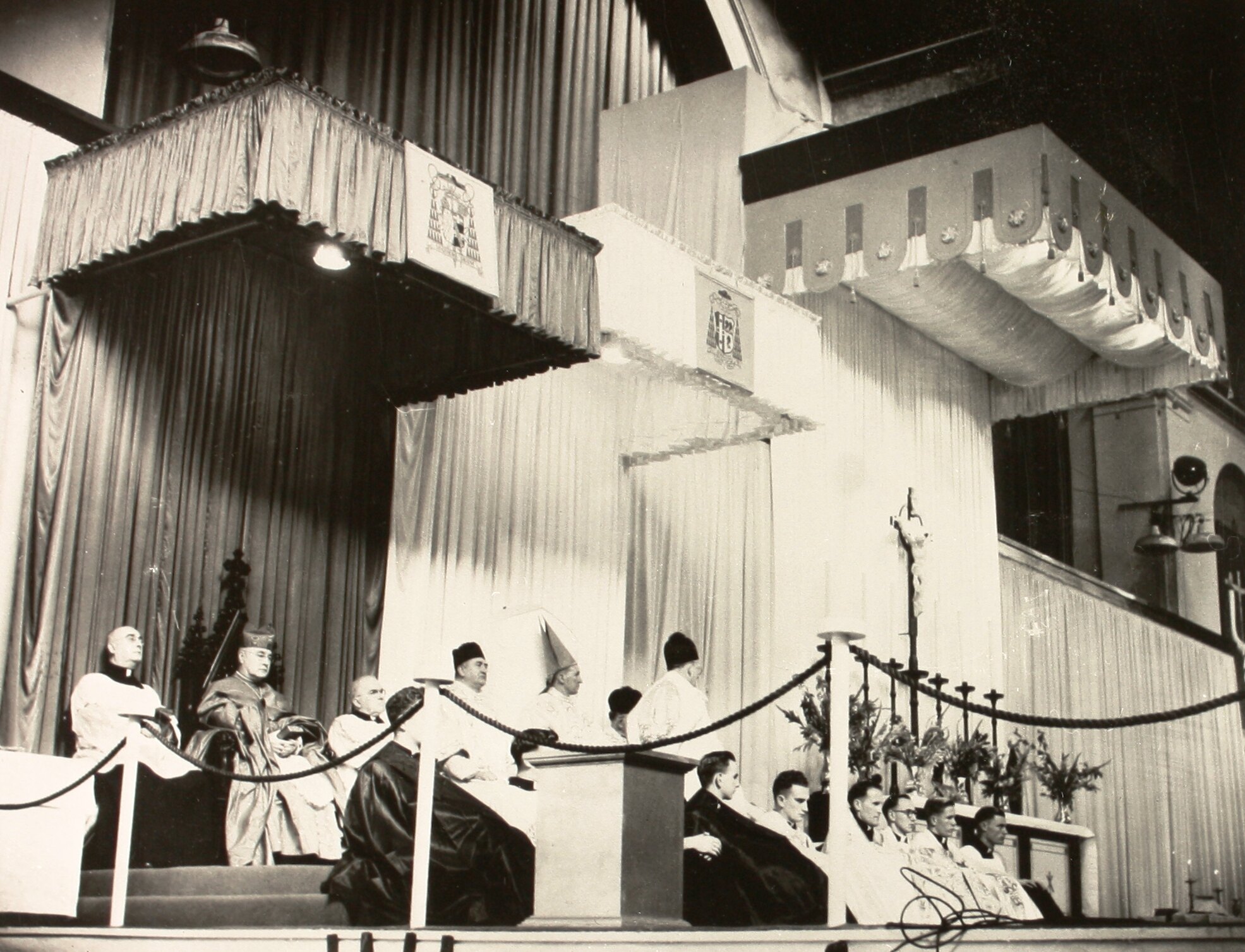 View of the seating on stage next to the temporary altar, showing various members of the Roman Catholic clergy, during a Roman Catholic service held in the Great Hall of the Exhibition Building in 1948.