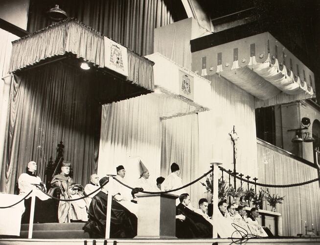 Black and white photograph taken during a Roman Catholic service held in the Great Hall of the Exhibition Building to celebrate the centenary of the Roman Catholic Diocese of Melbourne in 1948.
