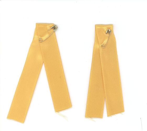 Yellow ribbon folded in half to make a 'V", with a brass safety pin holding the folded portions together.