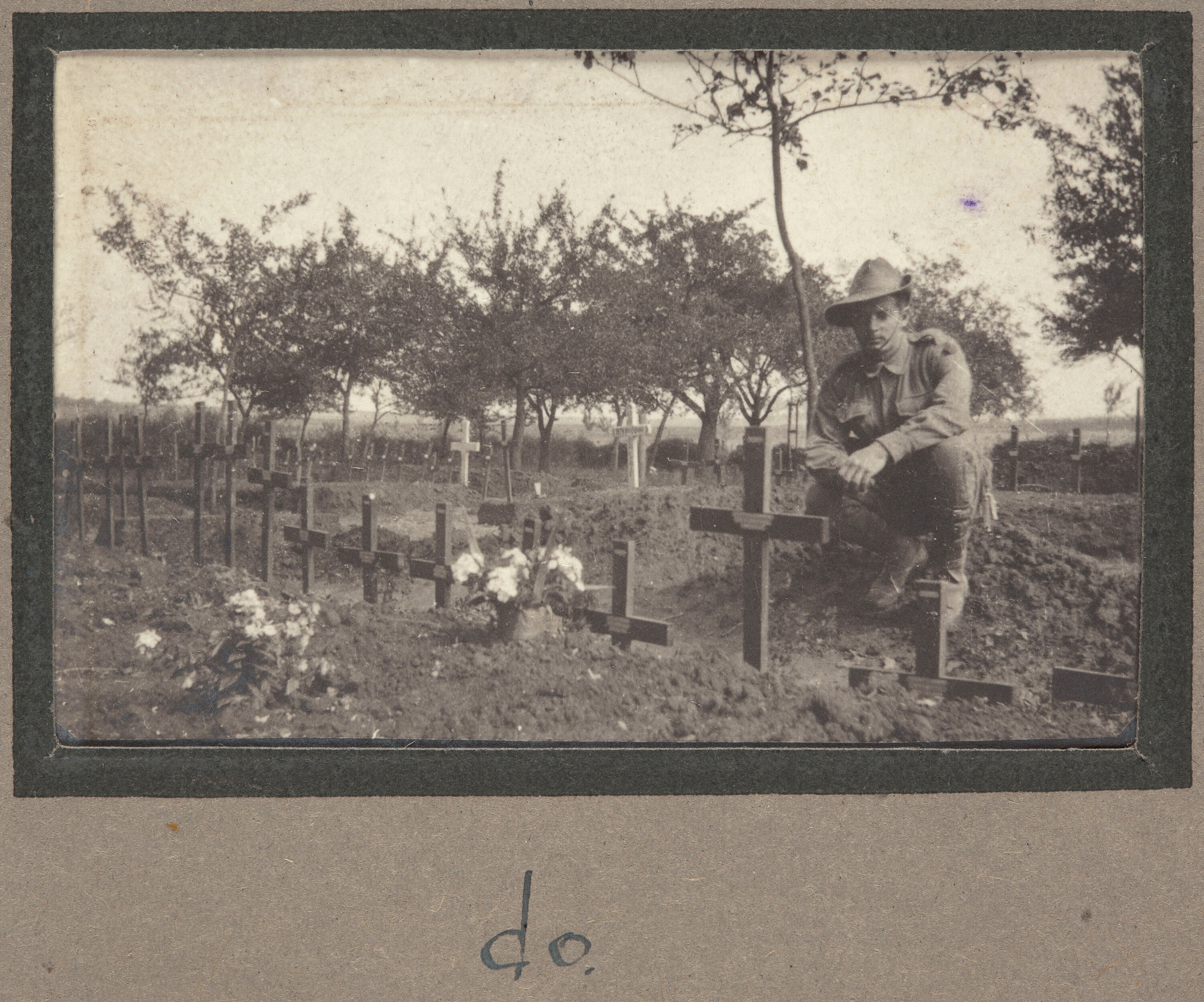 The image shows a small portion of the Warloy cemetery. There is a uniformed Australian soldier squatting next to a row of small wooden crosses. The crosses directly to the soldiers right have small bouquets on top of the graves. In the background rows of crosses in varying sizes spread across the landscape. Clusters of small trees can also be seen.