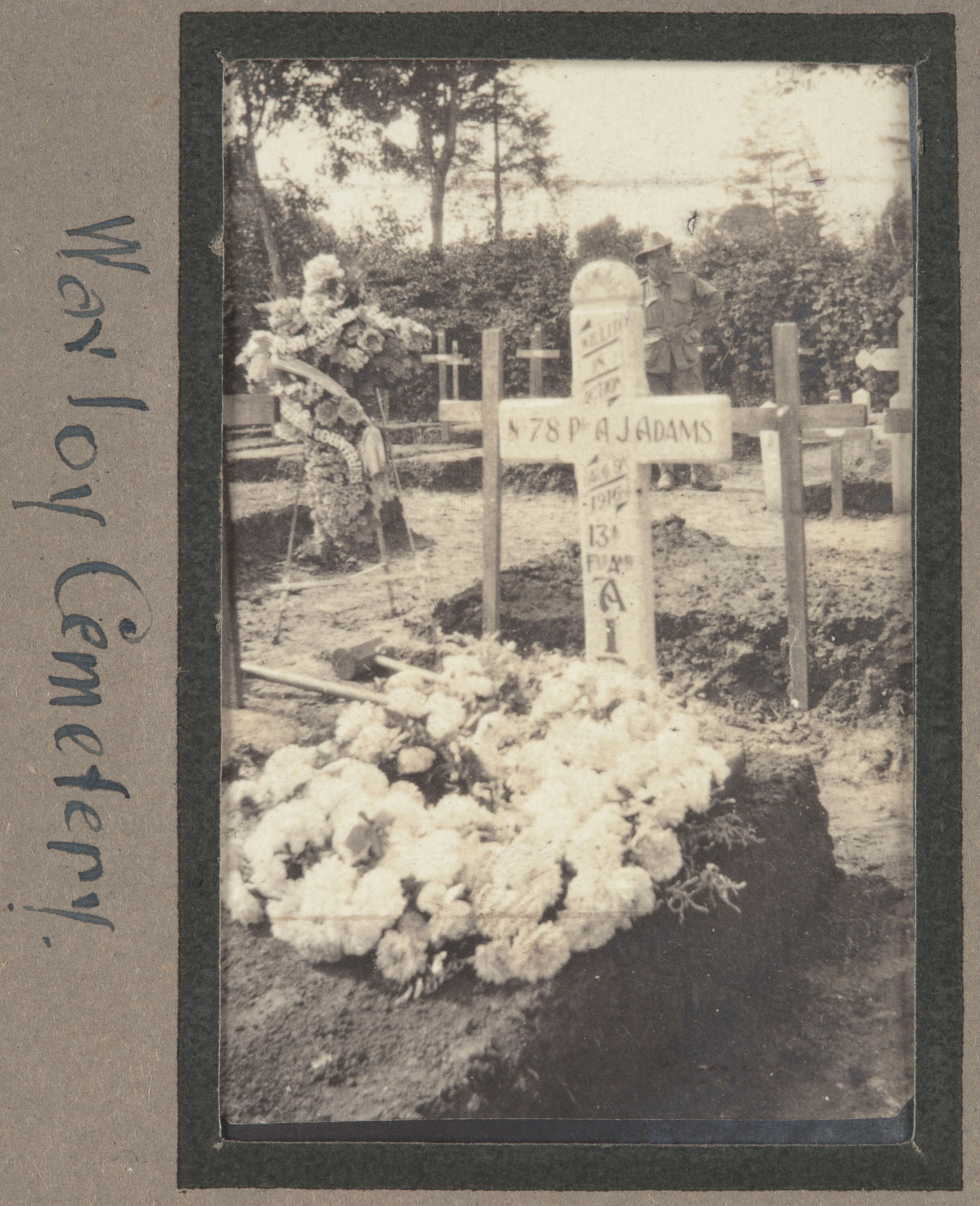 Black and white photographic print which depicts the cemetery at Warloy-Baillon Cemetery. The fighting from July to November 1916 on the Northern front of the Somme accounts for most of the soldiers buried in the Warloy-Baillon Cemetery. This particular headstone is for Private Arthur James Adams. Adams enlisted in the Australian Army on the 19th of August 1914 at 26 years of age. He passed away at the 3rd Field Ambulance Hospital in France (exact location unknown) on the 9th of August 1916 from wounds received in action.