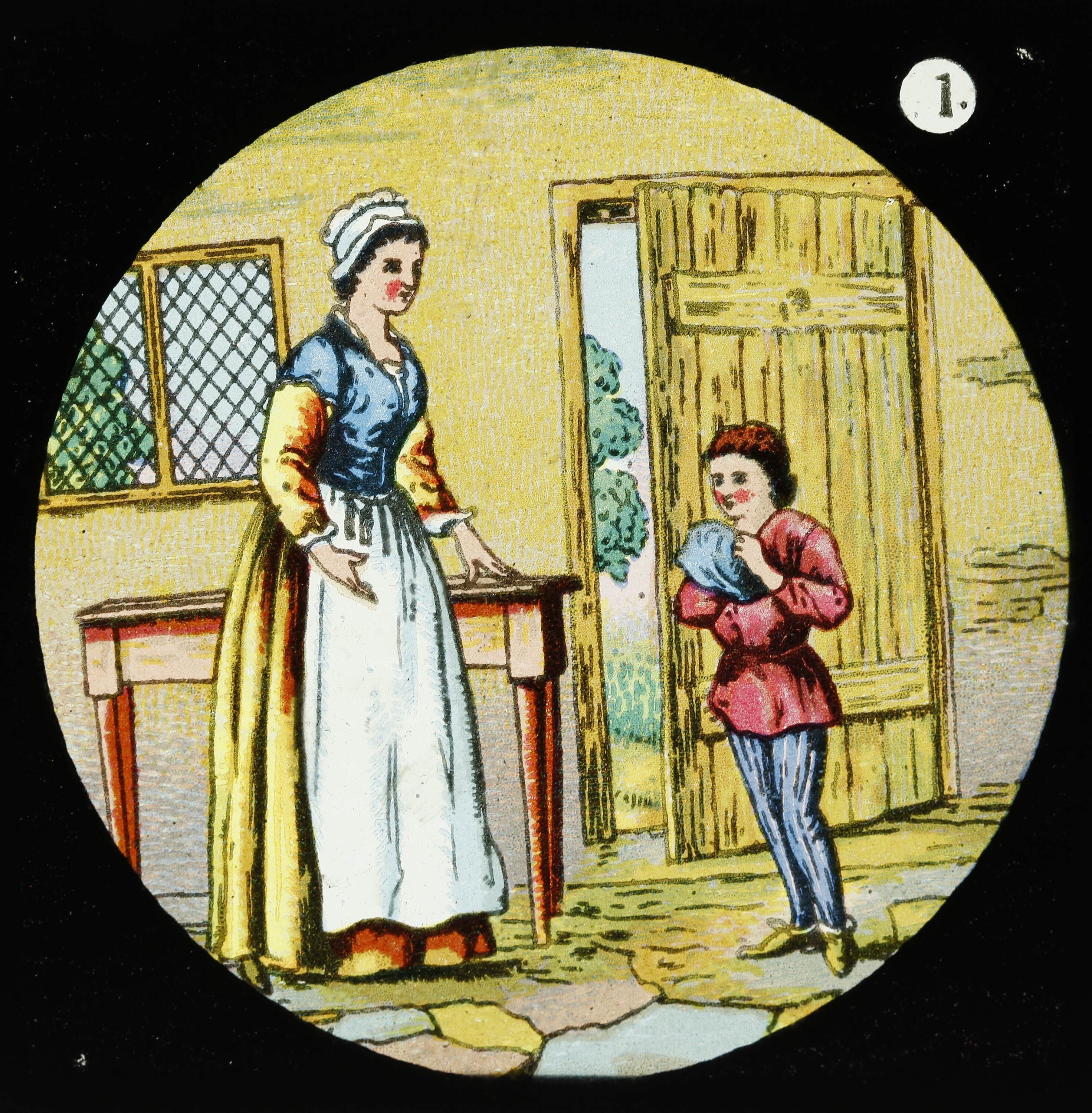 Lantern slide showing a boy with a woman in a domestic setting. A door is ajar behind him; he carries a bundle, as if having just entered. She looks down at him, raising her right hand, with her left hand on a table. The table stands under a window with diamond pane leadlight glass.