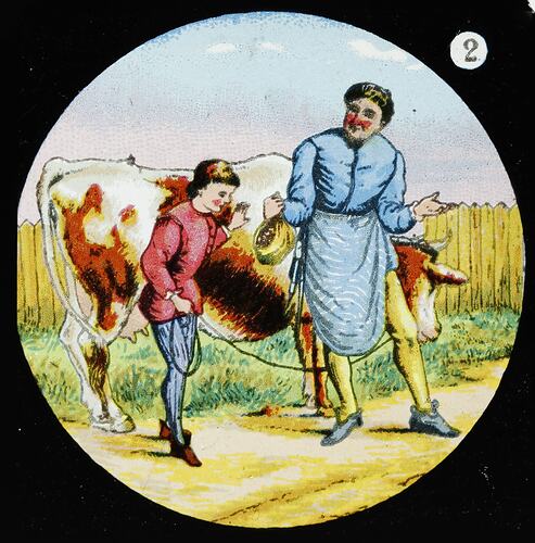 Lantern slide showing a boy holding a cow by a lead, speaking to a man in blue. The man wears an apron and blue shoes, and bare legs, and holds a bag in his right hand (money?) Grass and fence in background. The boy wears a red jacket, blue trousers and brown shoes.