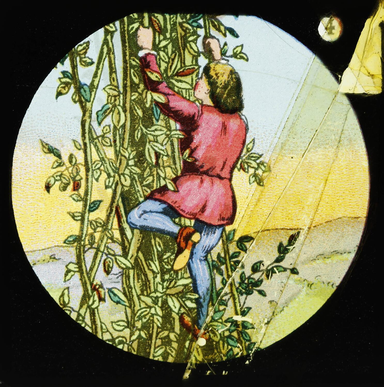 Lantern slide showing a boy climbing at a green beanstalk. He wears a red jacket, blue trousers and brown shows.