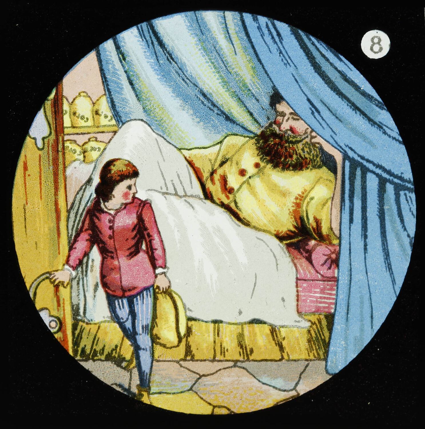 Lantern slide showing a giant man sleeping in bed. He has a full moustache and beard, and wears a hellow shirt with red buttons. A boy is pictured to the left of the bed, wearing a red jacket and blue trousers. The bed is draped with blue curtains; jars on shelves behind him appear to be inscribed 'corn'.