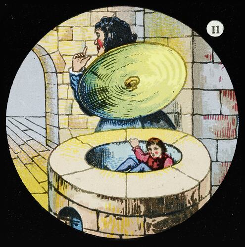 Lantern slide showing a boy wearing red and blue, sitting in a stone well or oven. A man holding a large lid is pictured standing behind. He looks furtively over his shoulder. The scene is set in a stone-walled building.