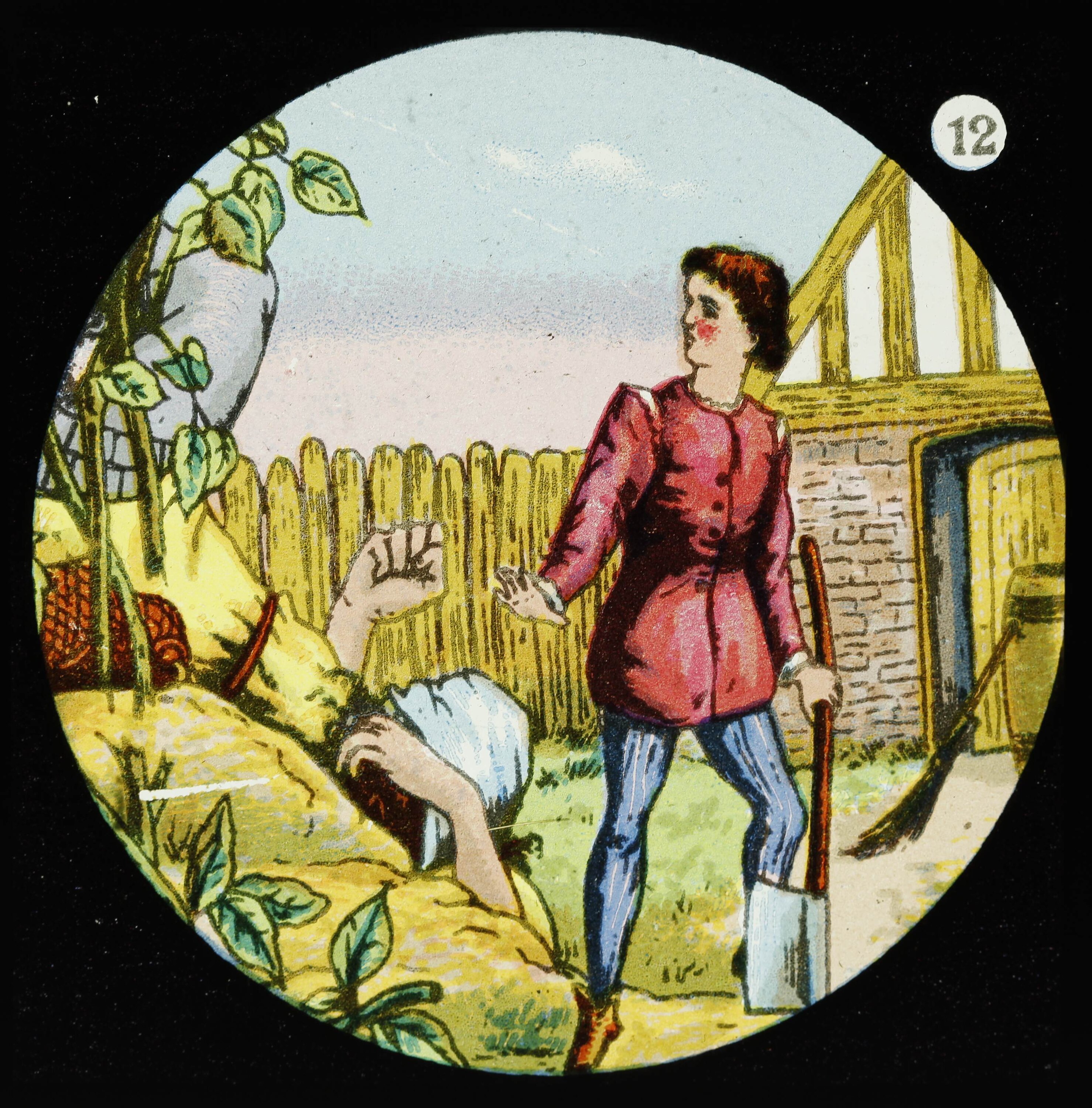 Lantern slide featuring a boy holding an axe. In front of him are a plant (beanstalk) and man lying on the ground; behind is a masonry building with half-timbered table and wooden door. The boy wears a red jacket, blue trousers and brown shoes.