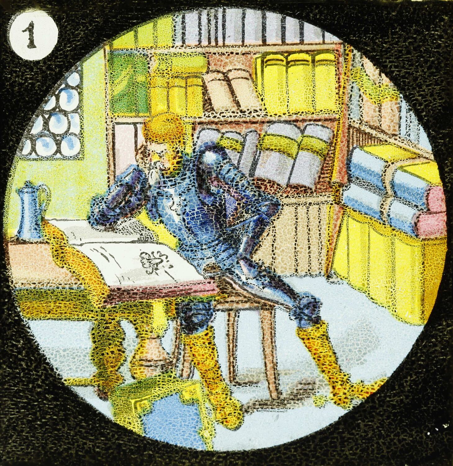 Lantern slide showing a man in armour sitting down at a table reading a book. Books are pictured on shelves in the background. A window with circular panes of glass appears to the left. A jug sits on the table adjacent to the book.