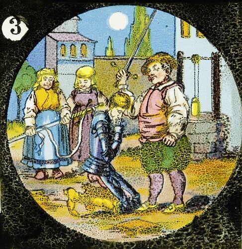 Lantern slide showing a man in armour kneeling down in front of another man who holds a sword above him as if anointing him. Two women are pictured in the background, one holding a sword (possibly the armoured man's sword). A well and low-scale buildings suggest a village.